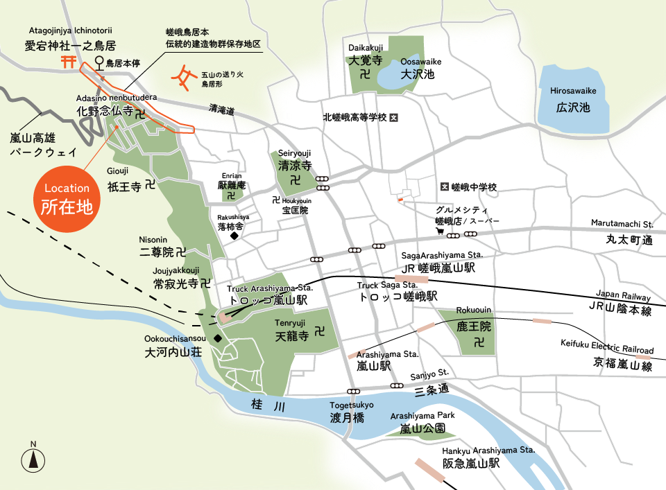 | Approx. 28 min. walk from North Exit of JR Saiin Main Line "Saga-Arashiyama Sta." | |