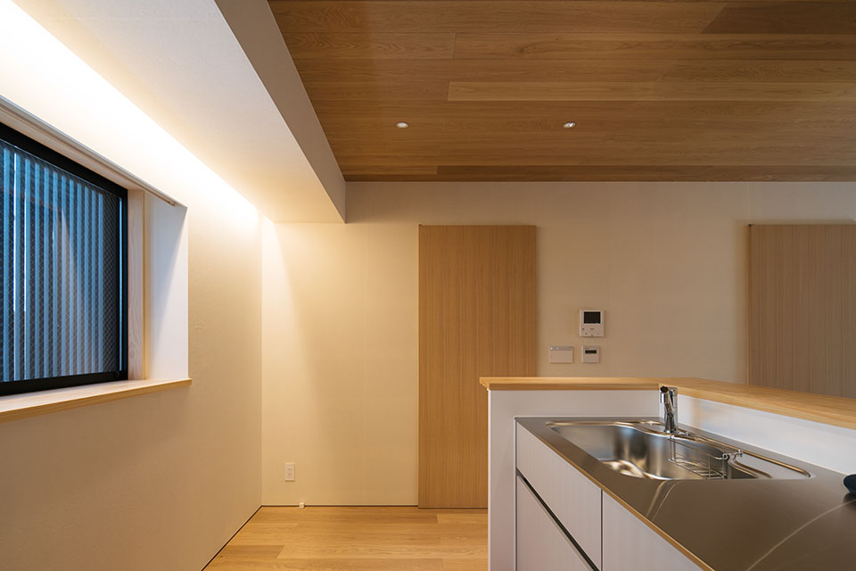 The Living-Dining-Kitchen features oak used continuously across both ceiling and roof elements, creating a refined horizontal rhythm that visually unifies the space.