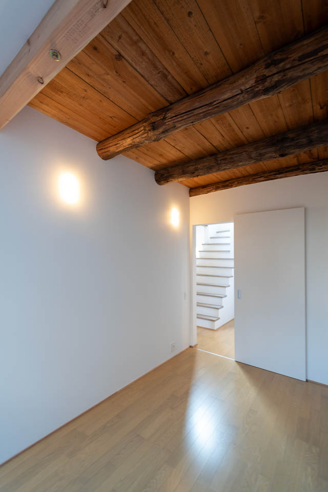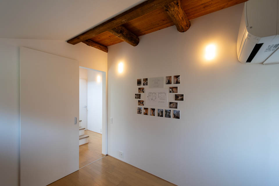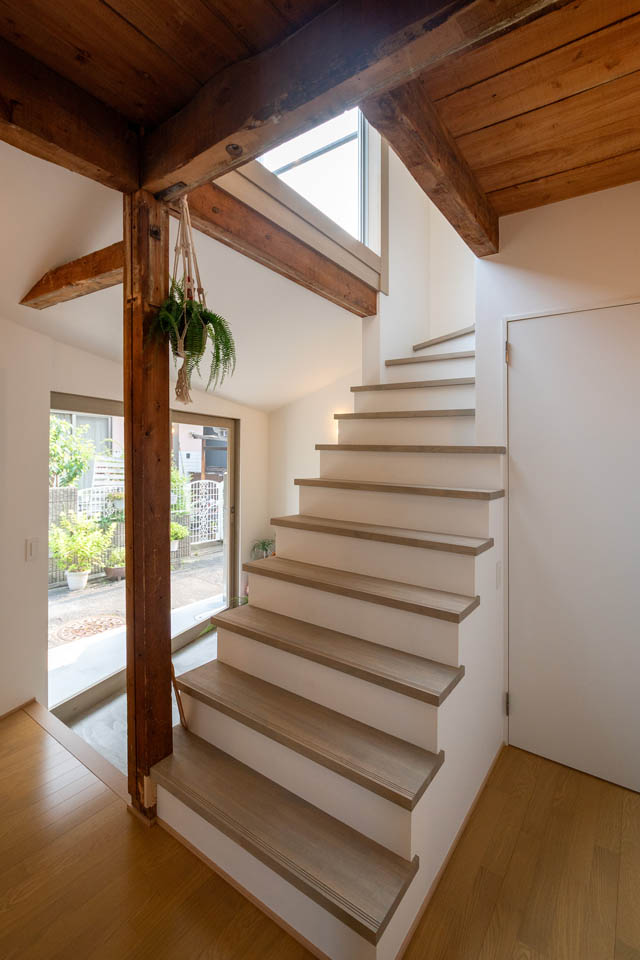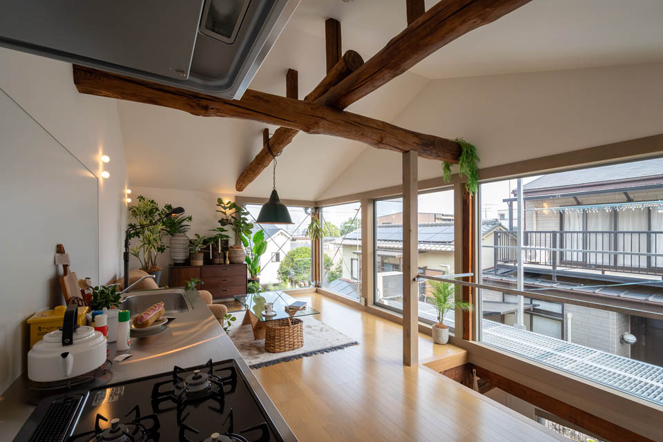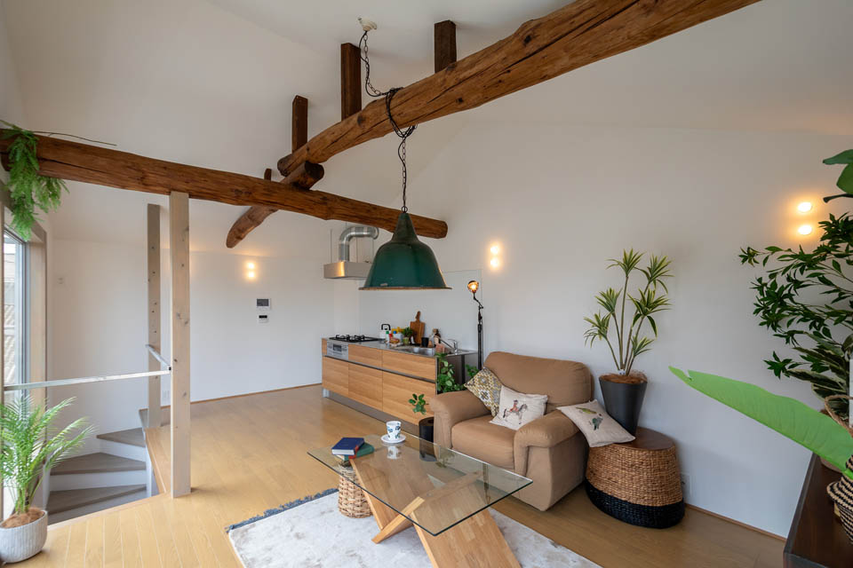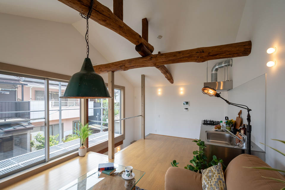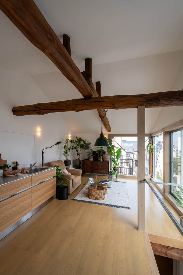 A bright, open-plan living, dining, and kitchen on the second floor offers abundant natural light and open views, highlighted by goronbo(exposed beams). The first floor includes compact water facilities and a private room suitable for a bedroom or workspace.