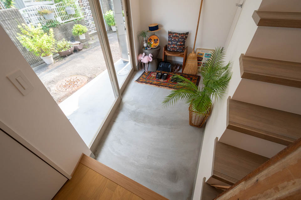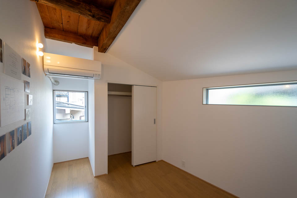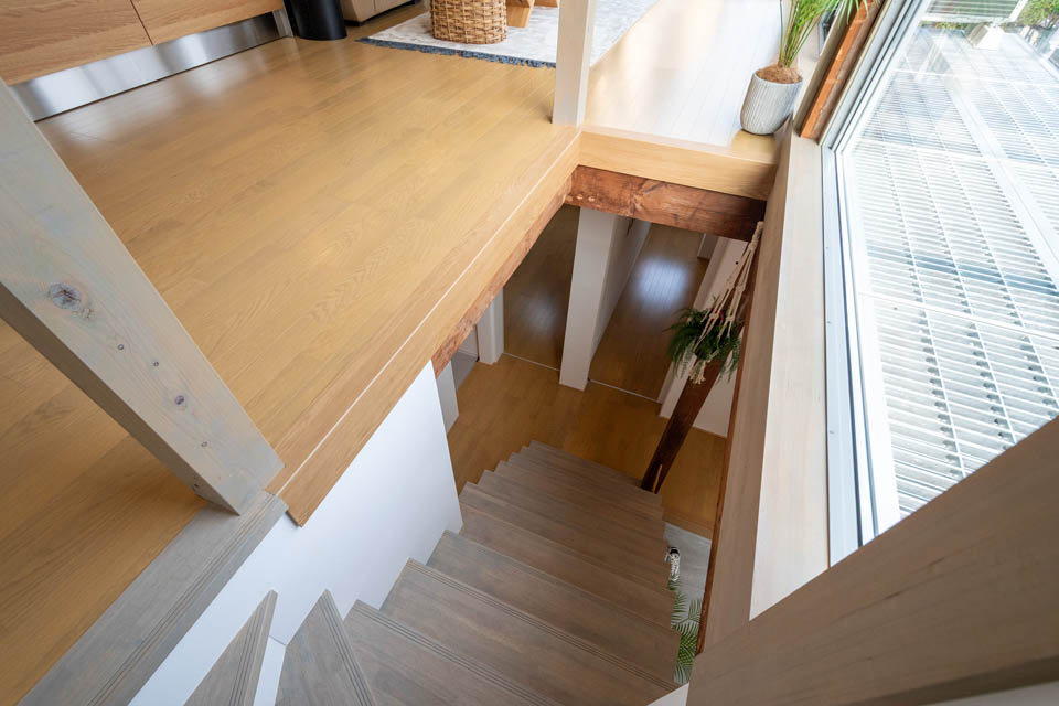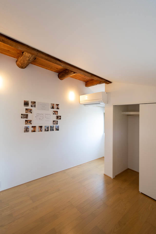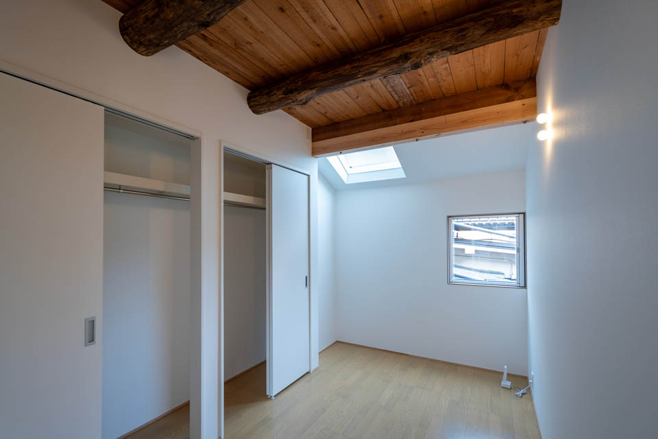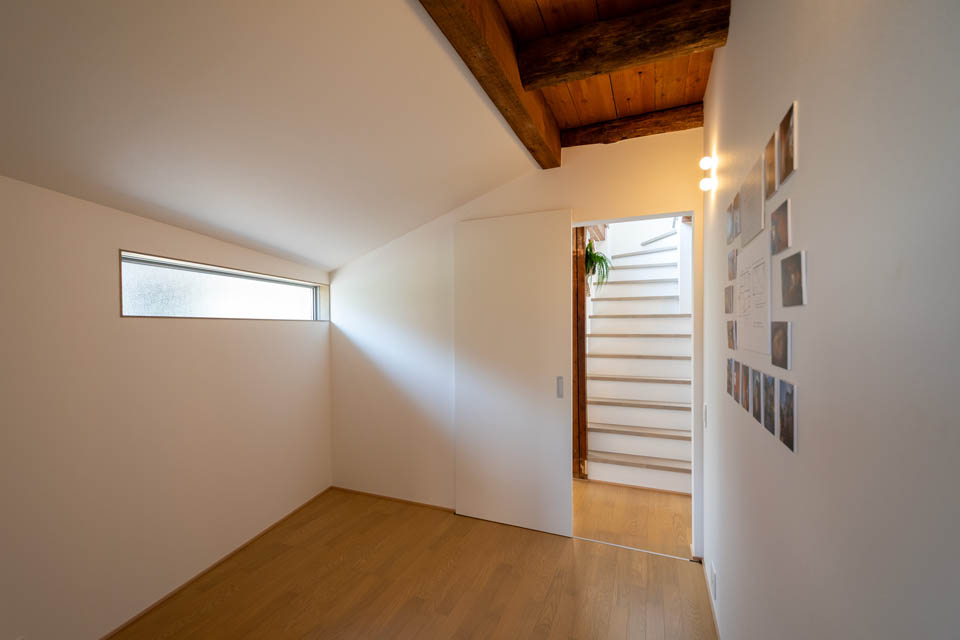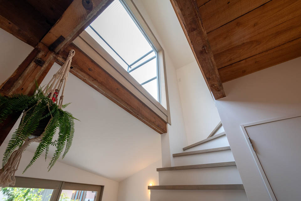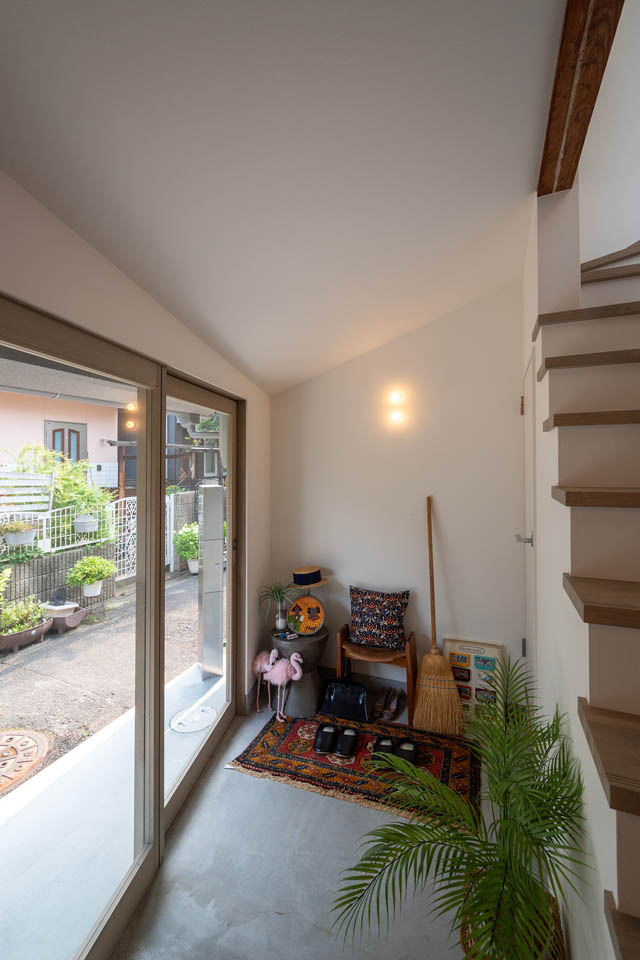 A bright, open-plan living, dining, and kitchen on the second floor offers abundant natural light and open views, highlighted by goronbo(exposed beams). The first floor includes compact water facilities and a private room suitable for a bedroom or workspace.