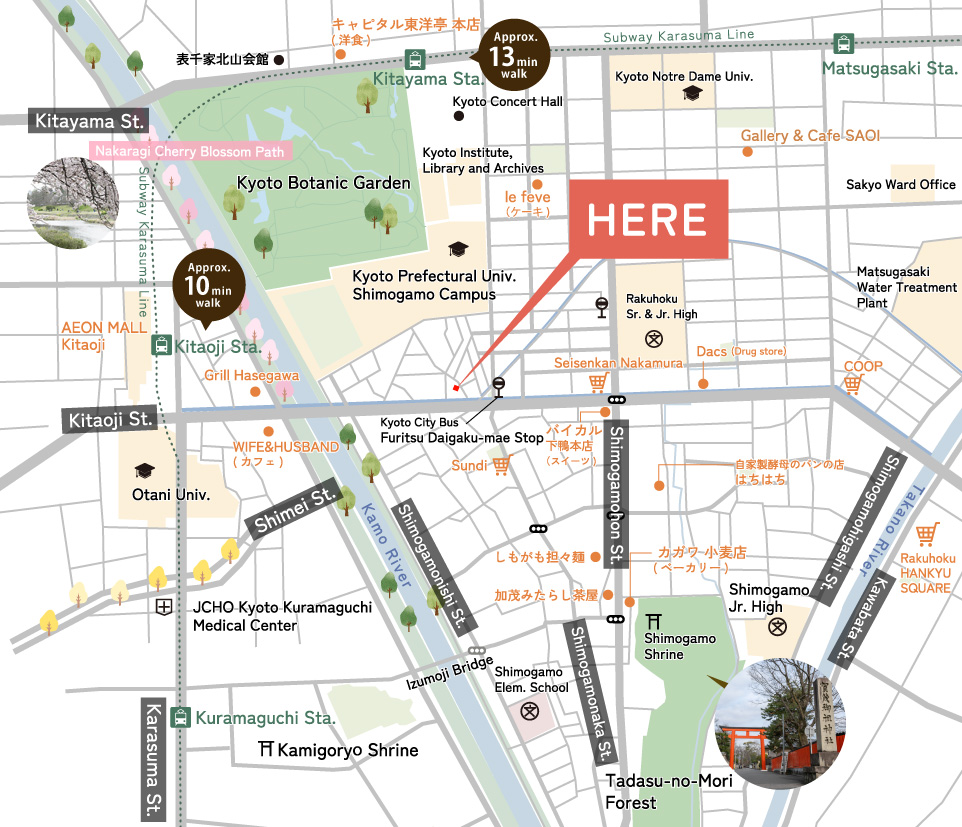 scrollApproximately a 10-minute walk to Kitaoji Station on the Subway Karasuma Line.This property is located in a highly convenient area along the subway line, while also offering a rich natural environment with the Kamo River within walking distance. The World Heritage Site Shimogamo Shrine is about a 12-minute walk away, and the Kyoto Botanical Gardens can be reached in about 10 minutes on foot—both are among Kyoto’s most celebrated attractions.From the nearby Kitaoji Bus Terminal, there is also excellent access to famous destinations such as Kinkaku-ji Temple and Kamigamo Shrine.It is an area that truly embodies the essence of Kyoto, where you can enjoy seasonal scenery and historic landmarks simply by strolling through the neighborhood.