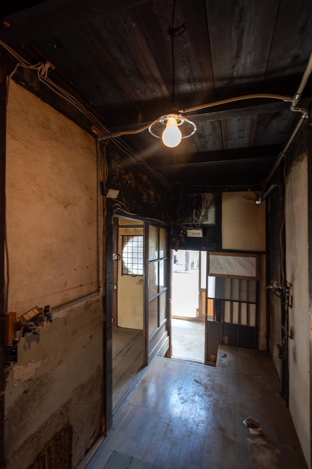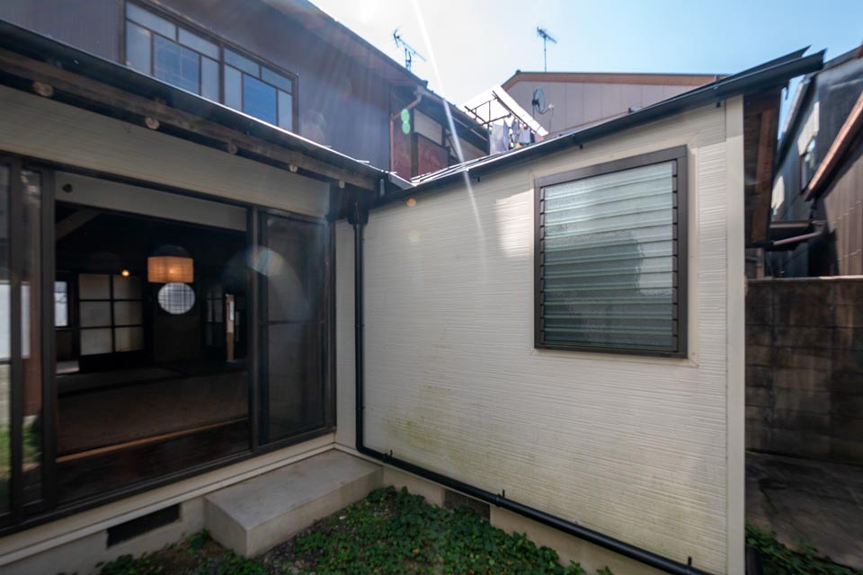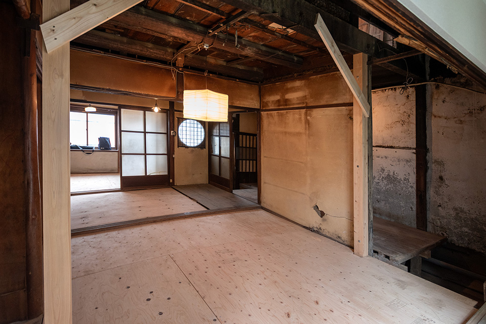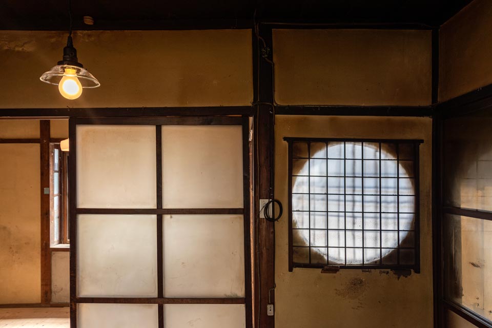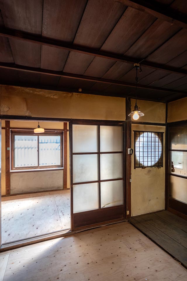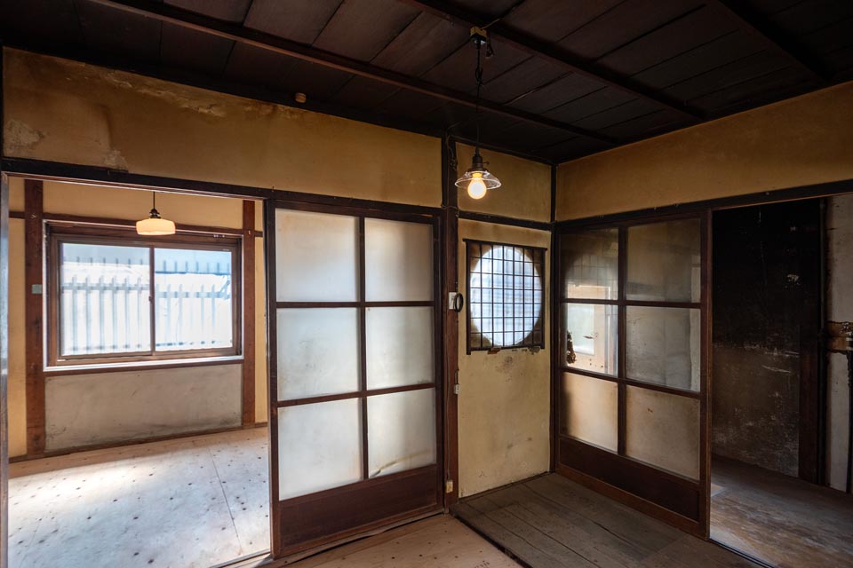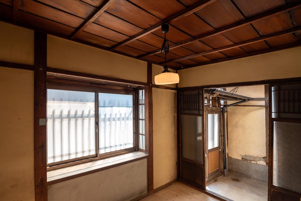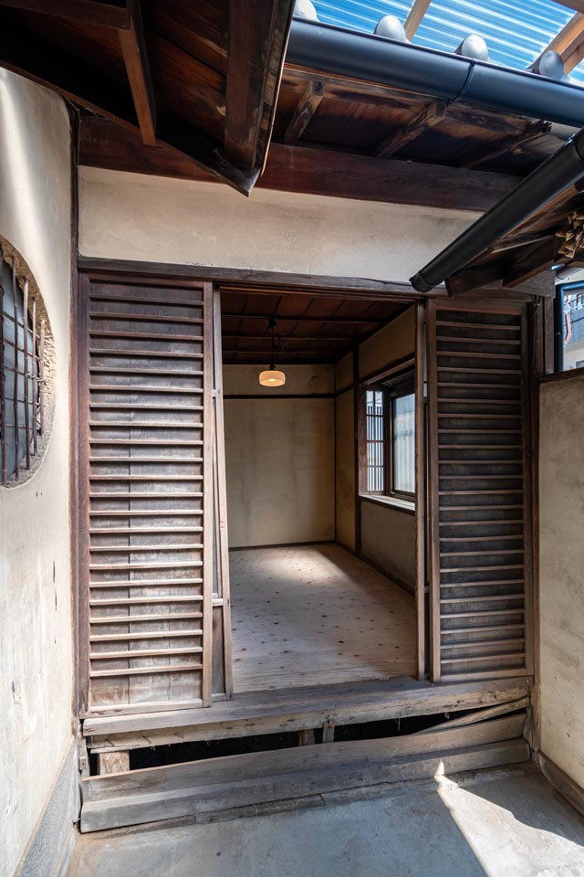 Facing Omiya Street, this compact Shimota-ya Kyomachiya still features its traditional moon window (marumado), giving it an elegant and refined character. With careful restoration, it has the potential to be reborn as a modest yet distinguished Kyomachiya.