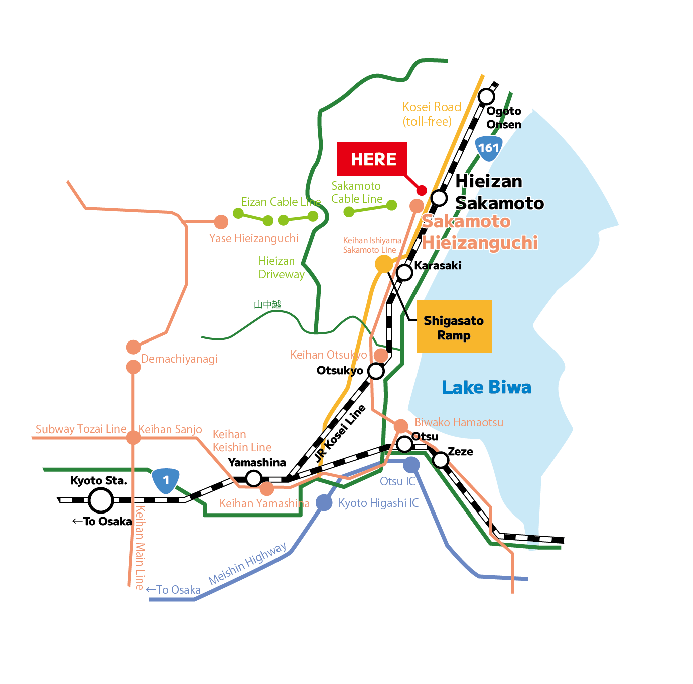 By car from Kyoto, take the Nishi-Otsu Bypass and exit at the “Shigasato” ramp. By train, it takes about 14 minutes from Kyoto Station on the JR Special Rapid Service to the nearest station, Hieizan-Sakamoto.