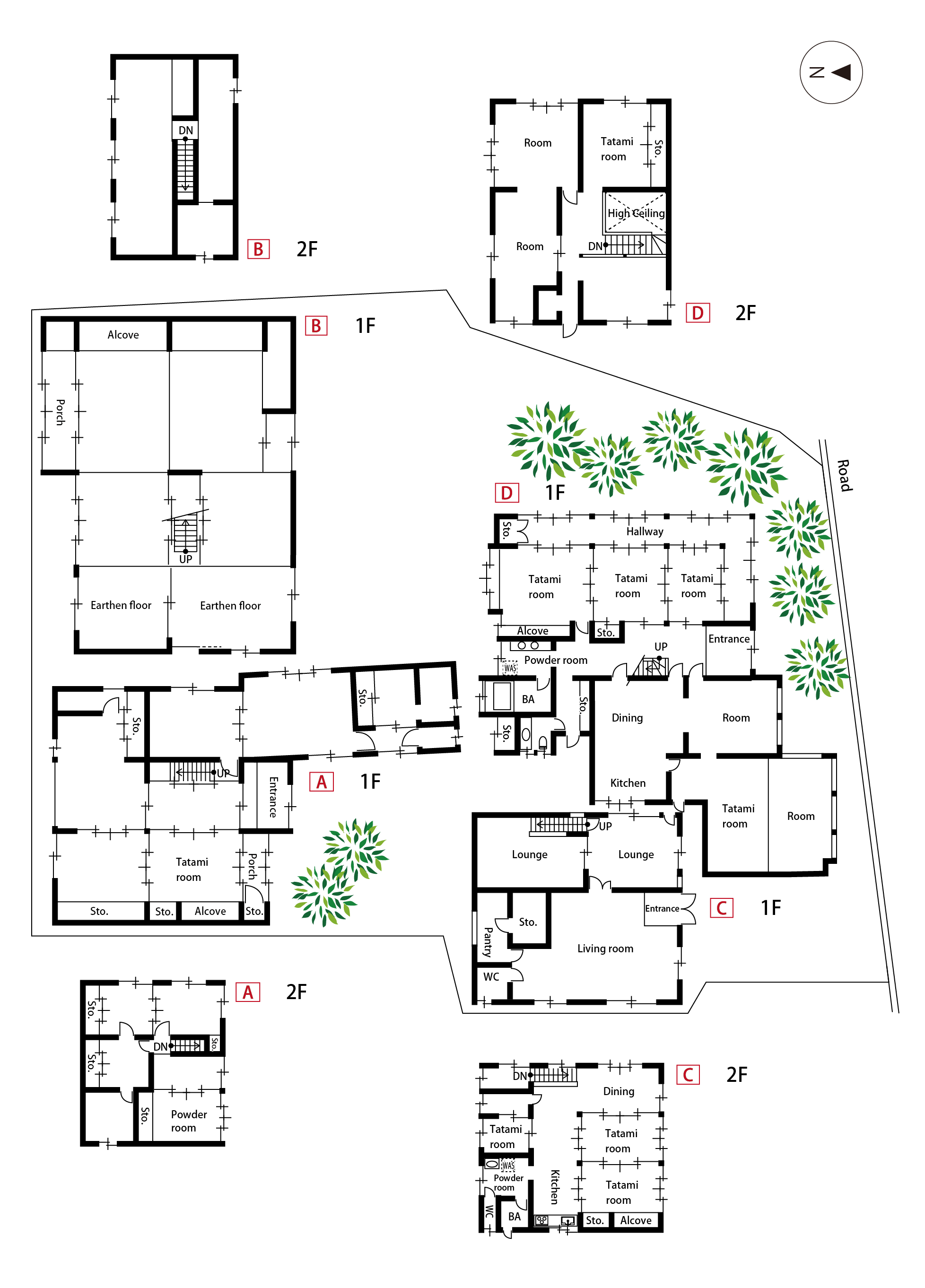 Floor Area | 【All 4 buildings as registered】 2818-3,1(D):1F:217.72 sqm, 2F:64.78 sqm, Total:282.5 sqm 2818-3,2(C):1F:100.27 sqm, 2F:100.27 sqm, Total:200.54 sqm 2818-3,3(A):1F:78.04 sqm, 2F:41.30 sqm, Total:119.34 sqm 2818-3,4(B):1F:118.13 sqm, 2F:70.31 sqm, Total:188.44 sqm |