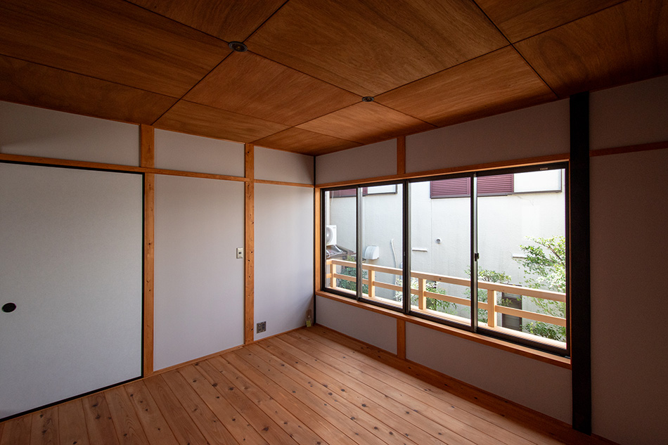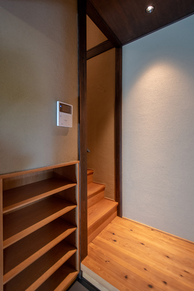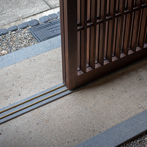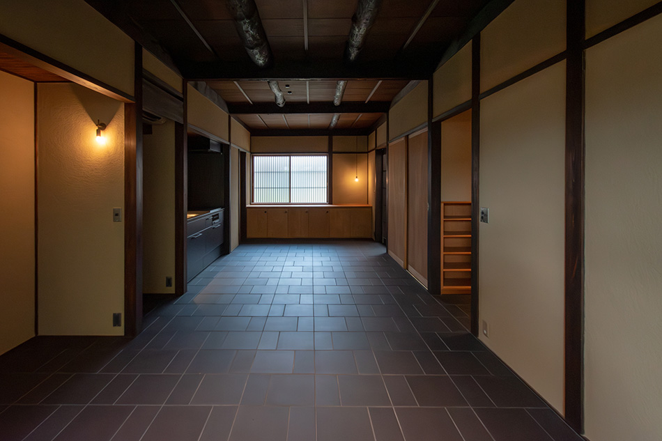 Located just off Shishigatani Street in the quiet residential district of Jodoji, this home welcomes you with a first floor paved entirely in ceramic roof tiles—extending from the entrance to the outdoor living area and creating a space rich in light and shadow.
