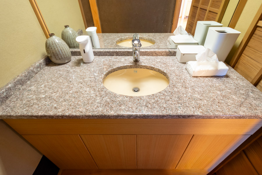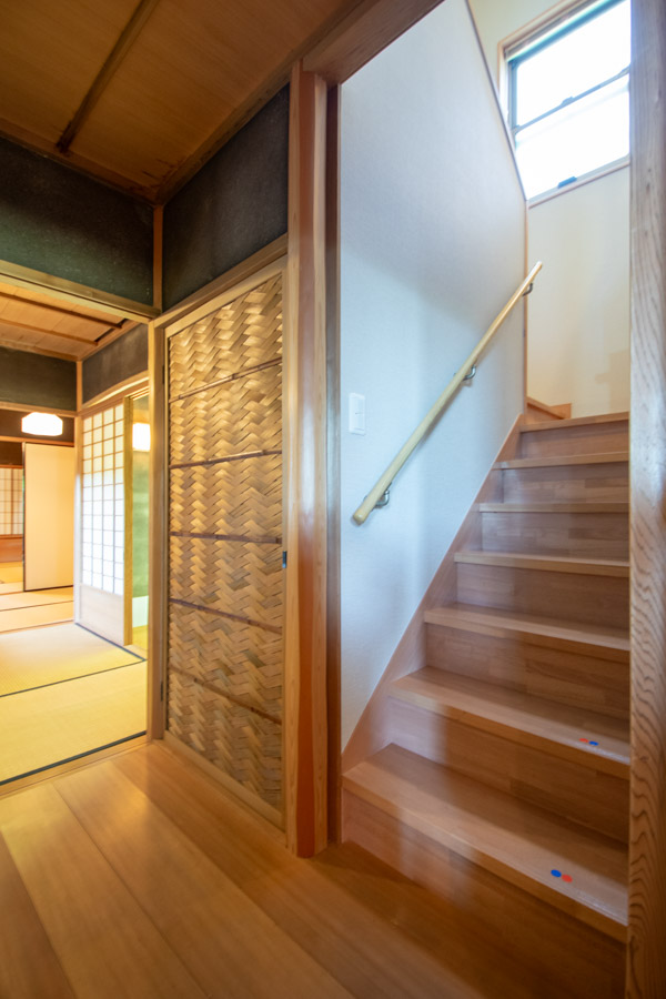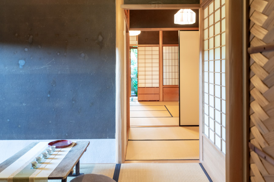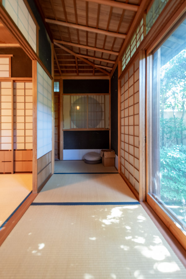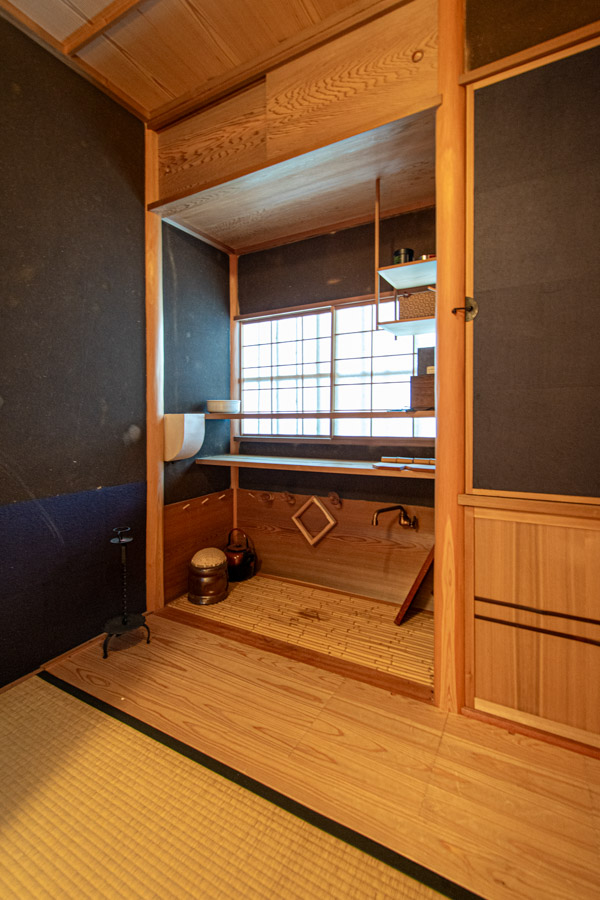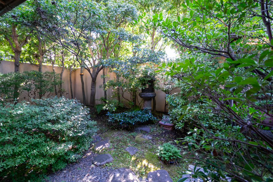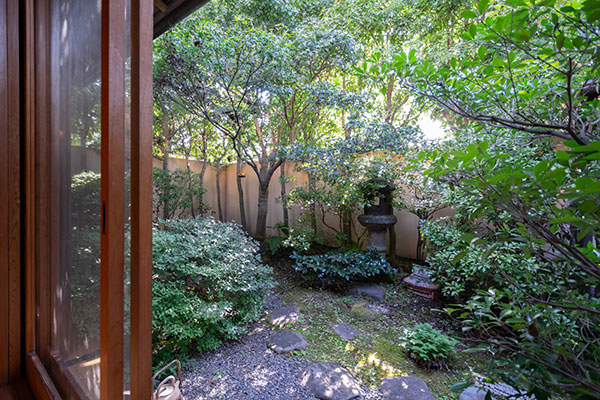 Beyond the stone-paved approach leading to the entrance, a tatami room opens quietly to a small south-facing garden. Further inside, a traditional mizuya (tea preparation area) and built-in oshiire storage lead to another tatami room facing the garden, where a nijiriguchi entrance evokes the refined spirit of the tea ceremony.