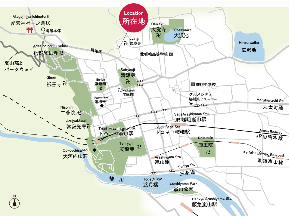 | Transportation | Approx. 18 min. walk from North Exit of JR Sanin Main Line "Saga Arashiyama Sta." |