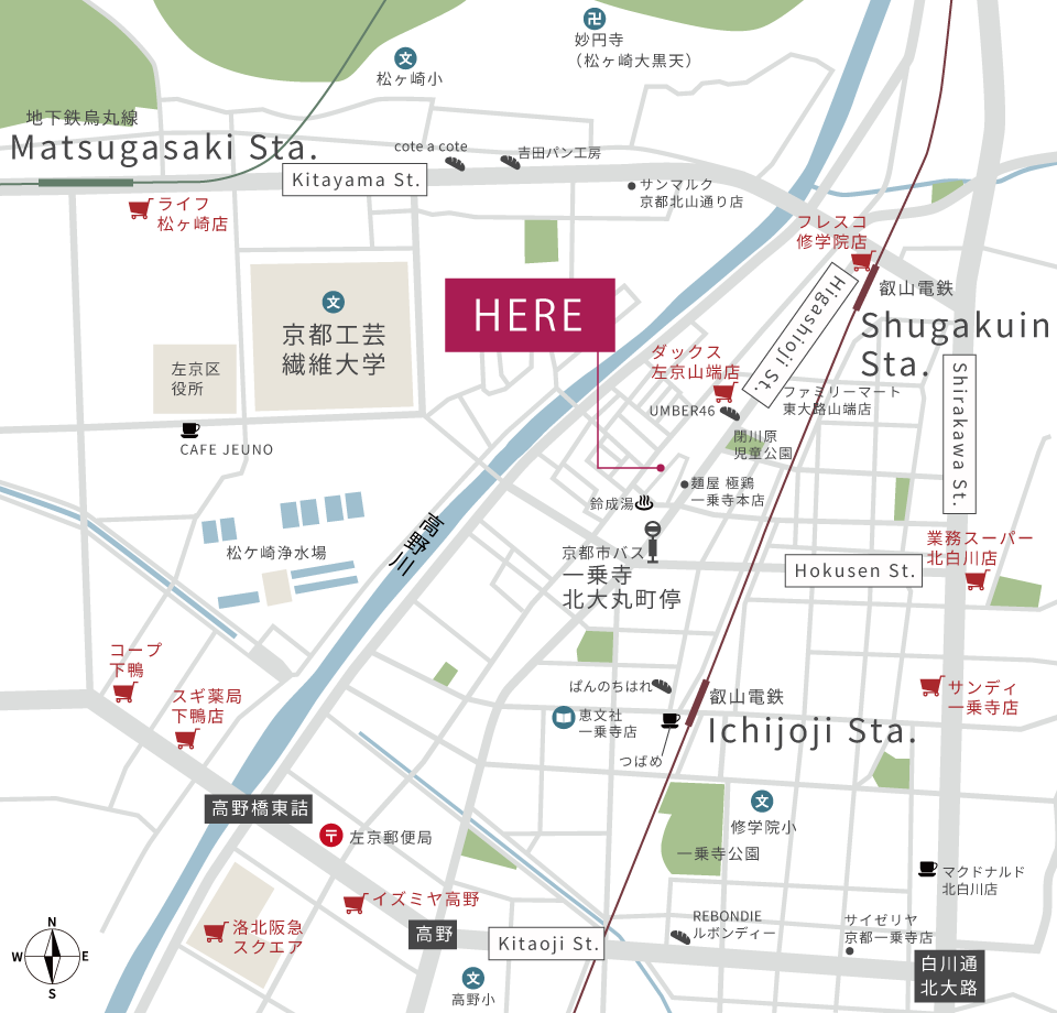 From Eizan Electric Railway’s Ichijoji Station, it takes approximately six minutes to reach Demachiyanagi Station. In addition, stepping out onto Kitaoji Street brings you to city bus stops, providing easy access to various parts of Kyoto. With a balance of natural surroundings and urban convenience, life in Ichijoji offers a calm and comfortable place to call home.