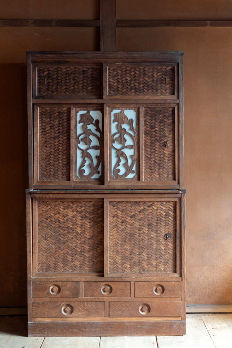 Inside, a traditional mizuya-dansu (kitchen chest) remains, with decorative elements such as woven bamboo or wood ajiro panels and finely carved latticework on its front—expressions of both practicality and craftsmanship.