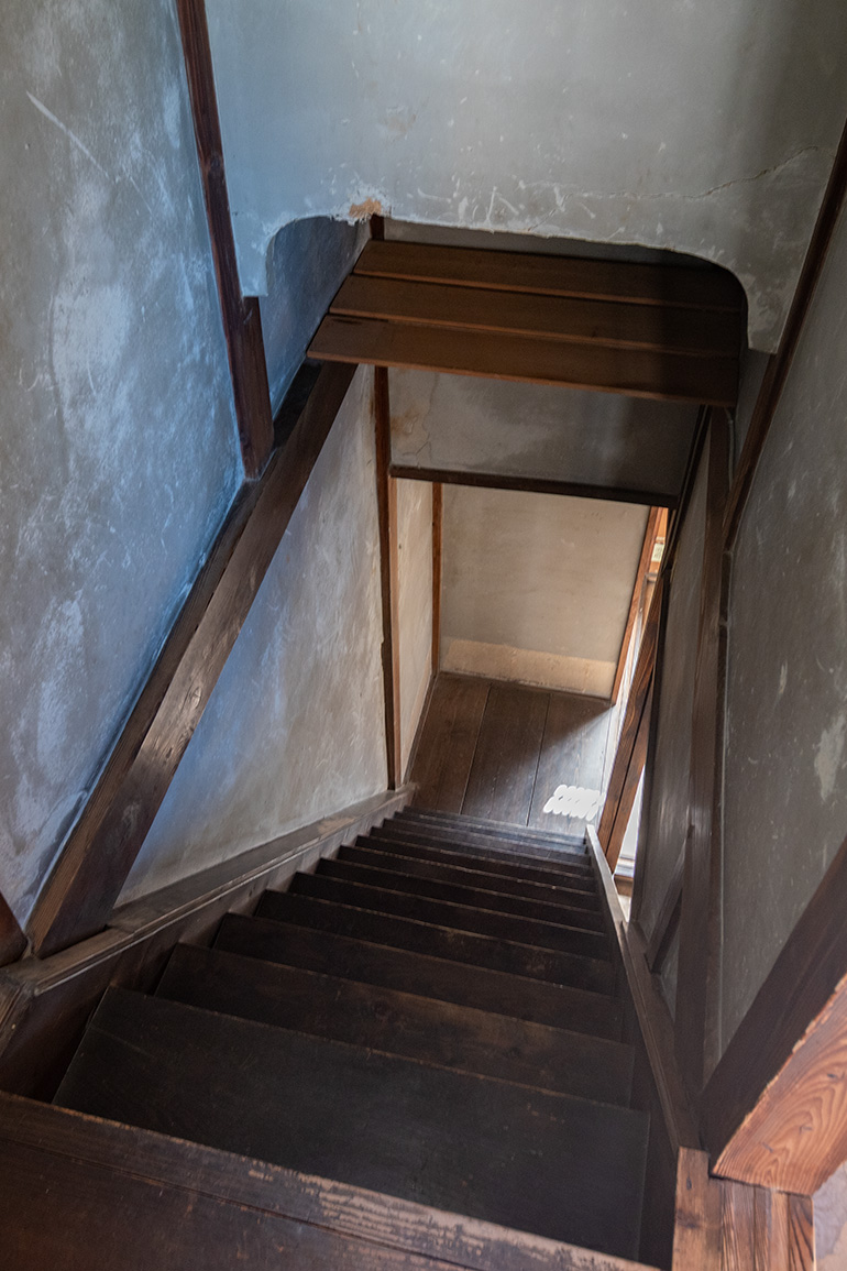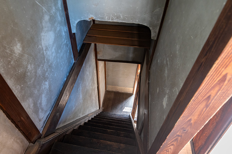 Above the staircase, a softly curved arched wall has been designed, lending a gentle sense of depth and a subtle warmth to the interior. This distinctive curved feature helps reduce visual heaviness, reflecting the refined aesthetic sensibility unique to machiya design.