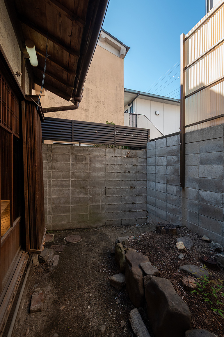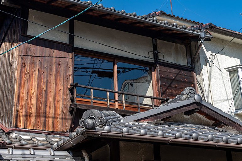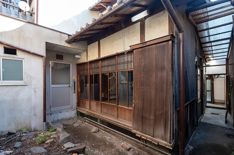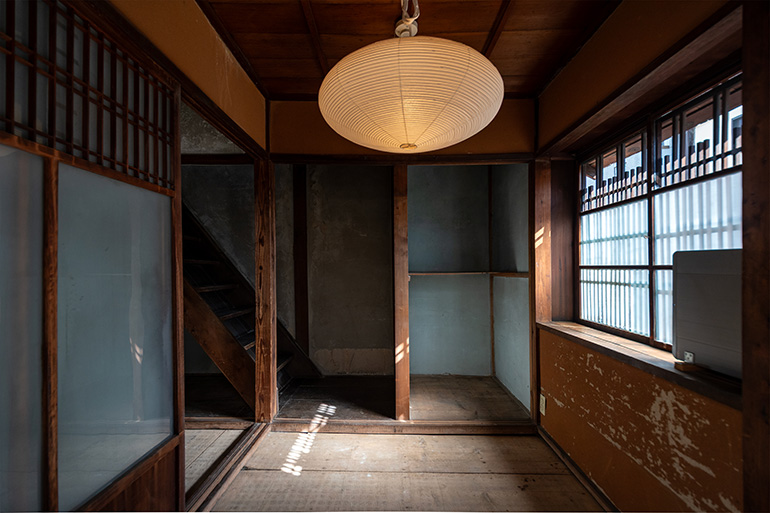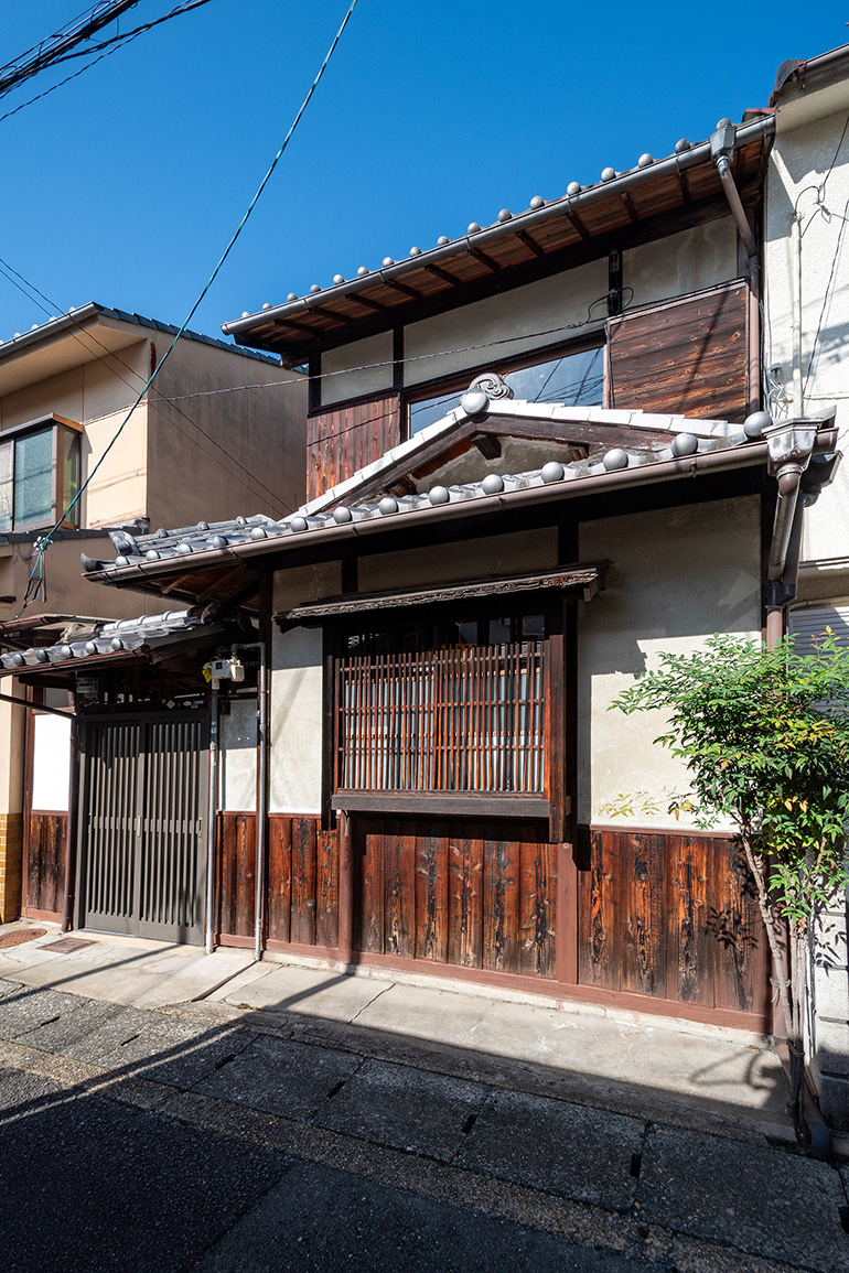 At the front of the first floor, traditional vertical lattice windows allow soft daylight to filter into the interior while gently shielding views from the outside—an architectural detail characteristic of Kyoto machiya. The exterior walls feature wooden siding and earthen plaster finishes, whose weathered textures add depth and quiet charm accumulated over many years.