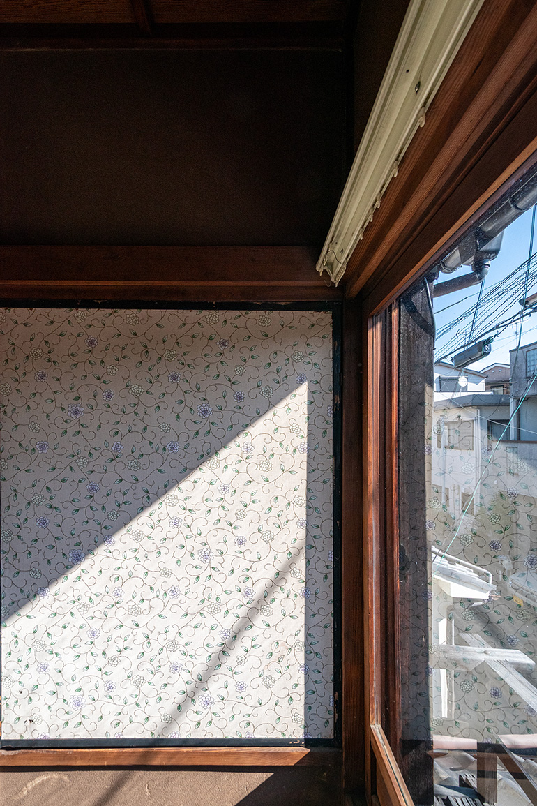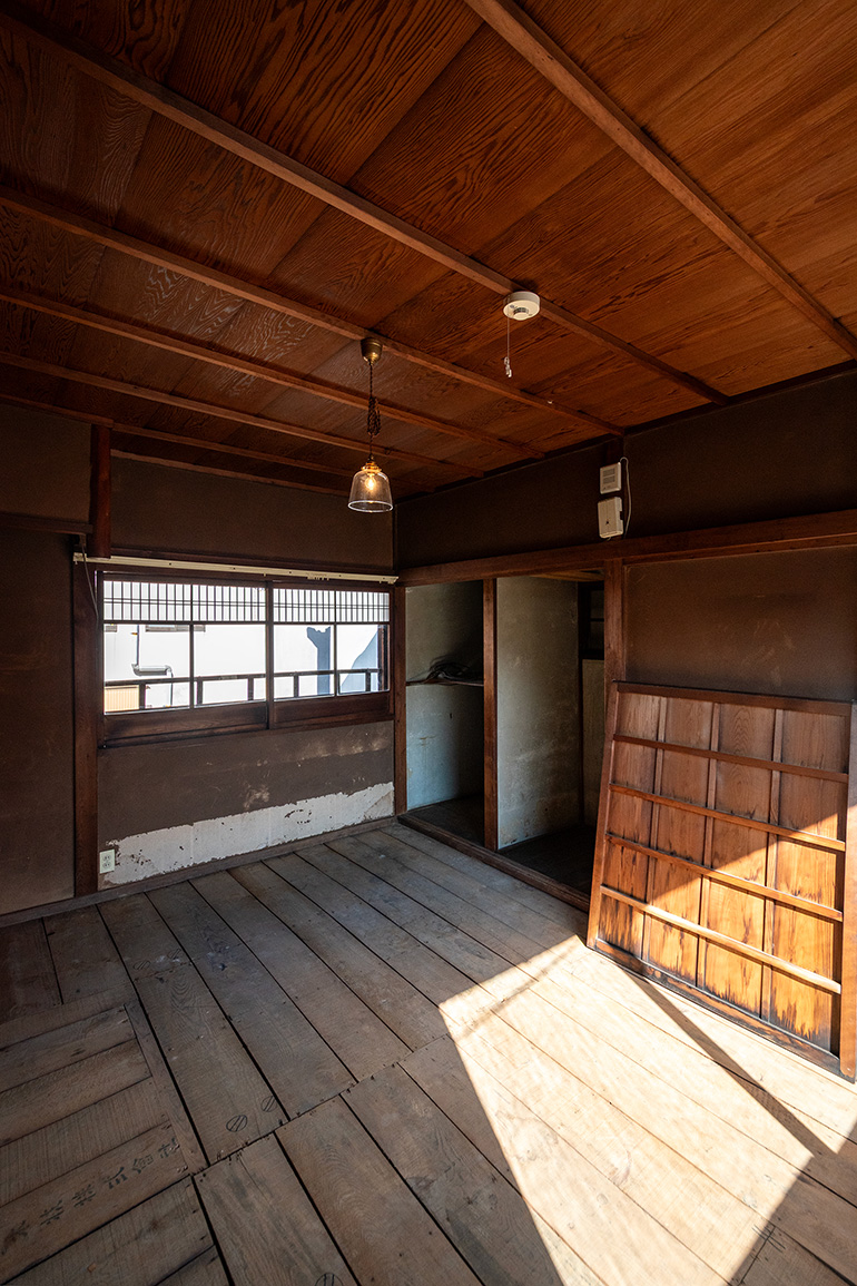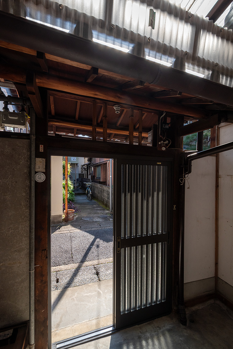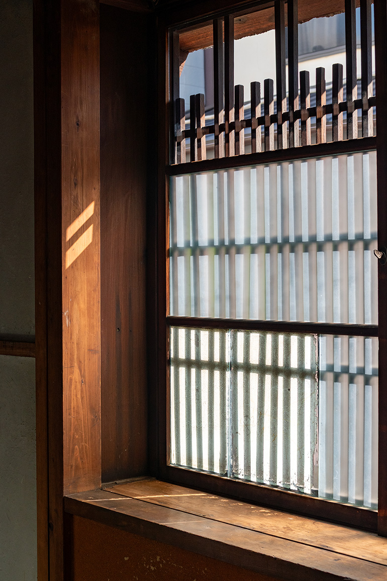 At the front of the first floor, traditional vertical lattice windows allow soft daylight to filter into the interior while gently shielding views from the outside—an architectural detail characteristic of Kyoto machiya. The exterior walls feature wooden siding and earthen plaster finishes, whose weathered textures add depth and quiet charm accumulated over many years.