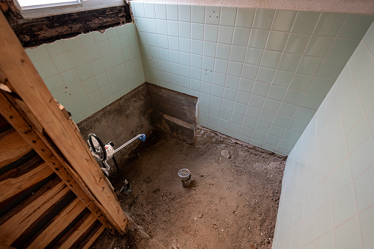 Inside, portions of the structure have been opened up, exposing beams and pillars after the removal of interior finishes.