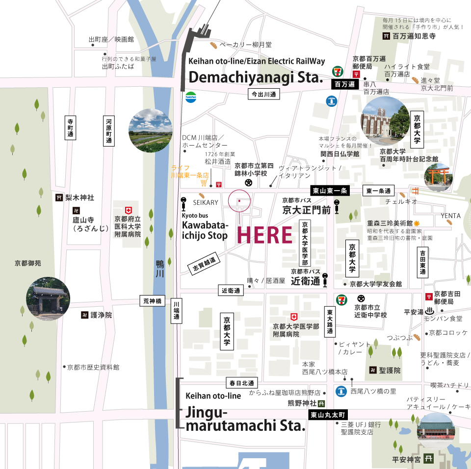 | Approx. 11 min. walk from Eizan Electric Railway "Demachiyanagi Sta." | |