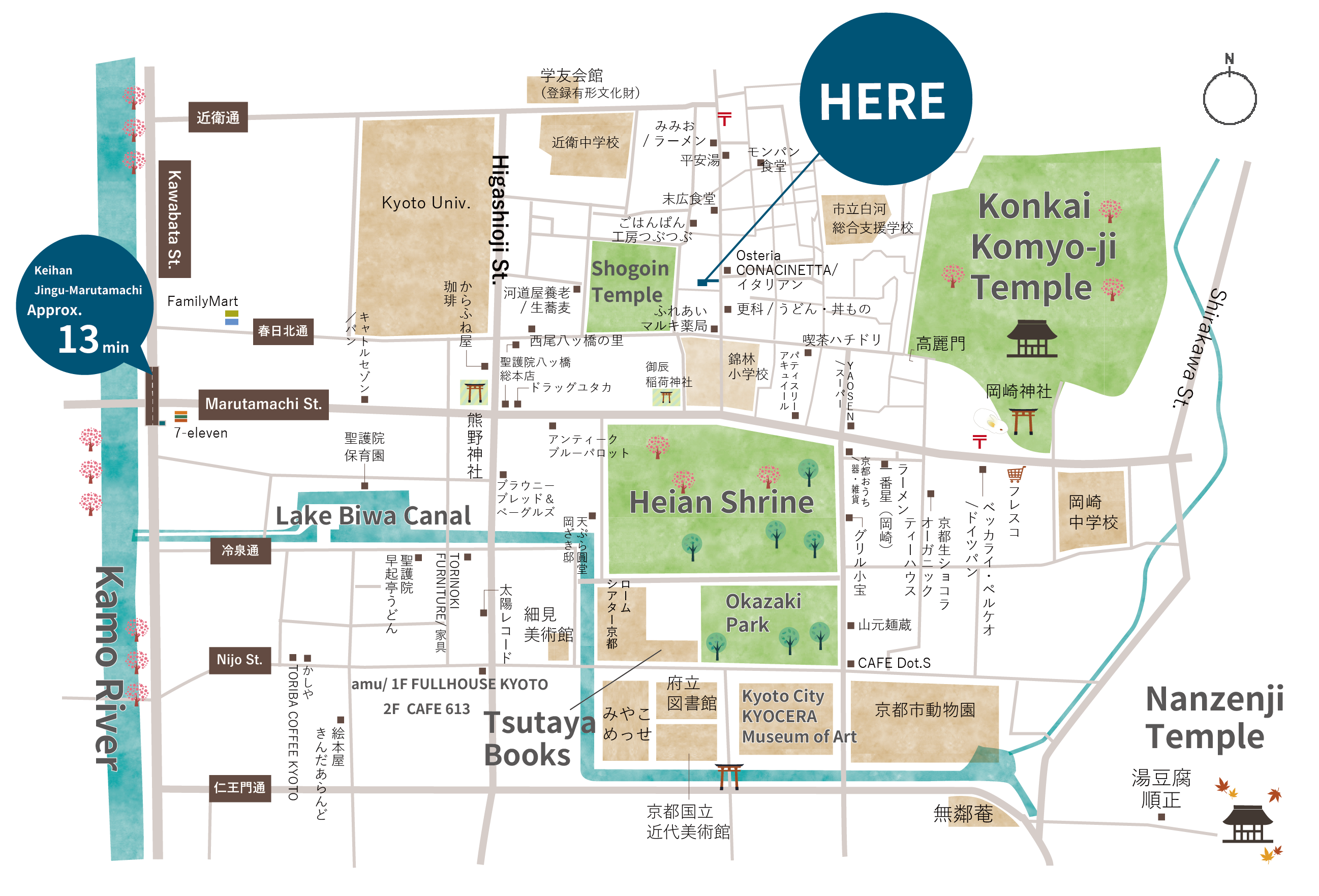| Approx. 13 min. walk from Exit 5 of Keihan Railway "Jingu Marutamachi Sta." | |