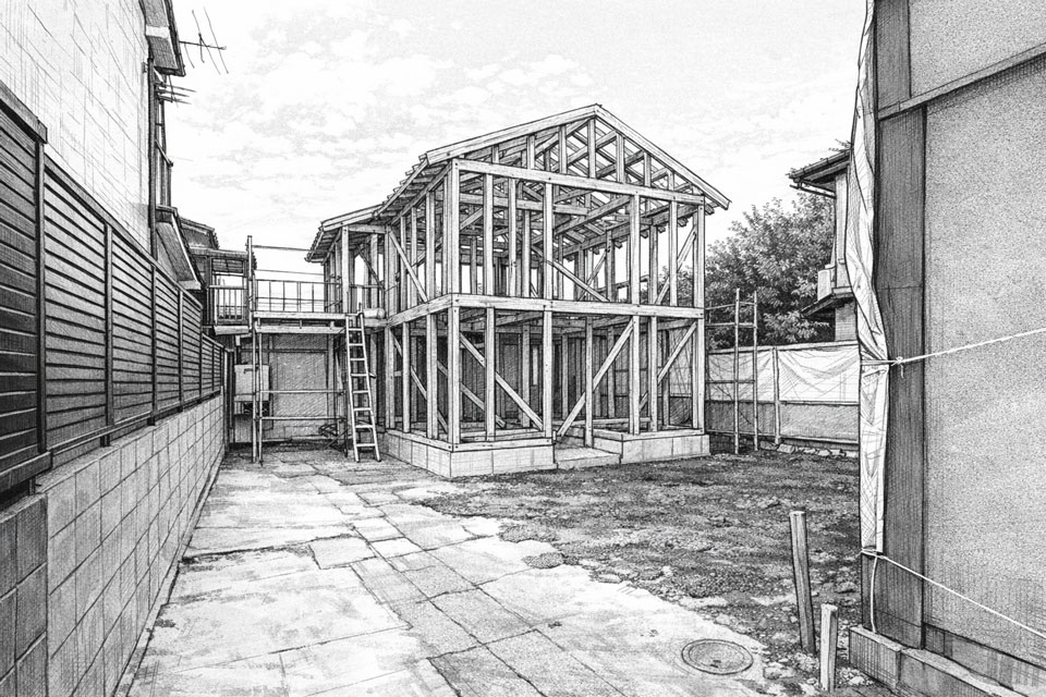 By renovating the house and adding an engawa-style veranda facing the open lot, a generous garden can be created.